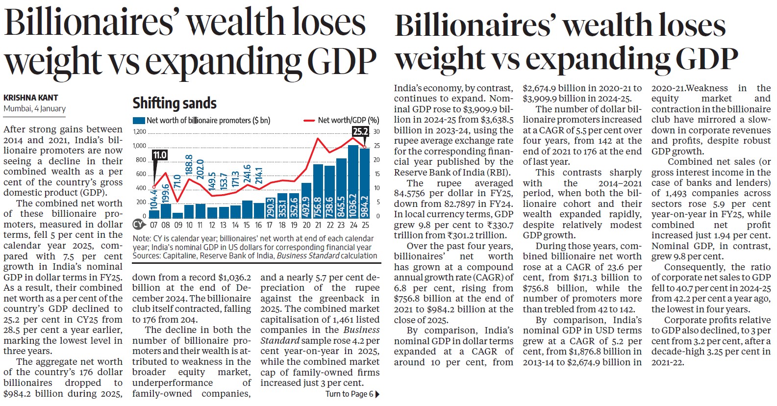 After strong gains between 2014 and 2021, India’s billionaire promoters are now witnessing a relative decline in wealth when measured as a percentage of the country’s gross domestic product (GDP). The combined net worth of these billionaire promoters, calculated in dollar terms, declined 5 per cent in calendar year 2025, even as India’s nominal GDP expanded 7.5 per cent in dollar terms during FY25.