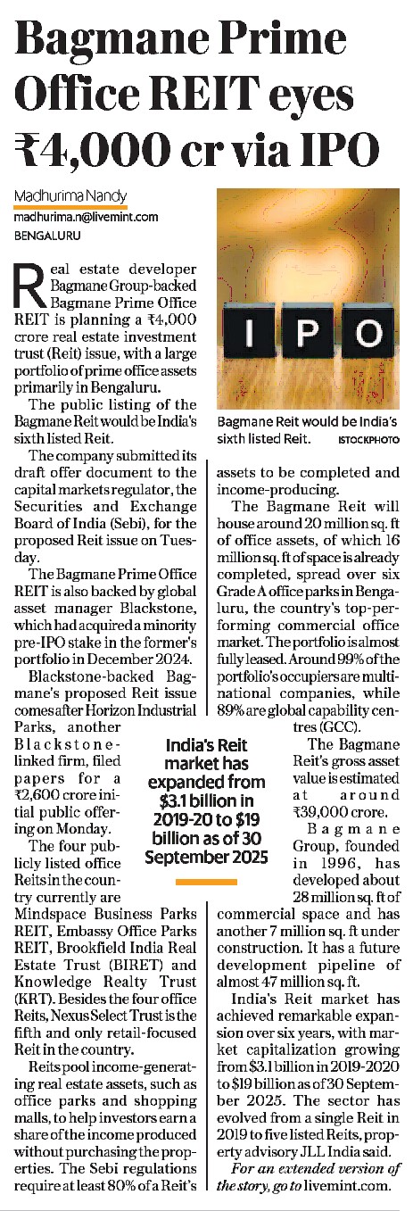 Real estate developer Bagmane Group-backed Bagmane Prime Office REIT is planning a Rs 4,000 crore real estate investment trust (Reit)...