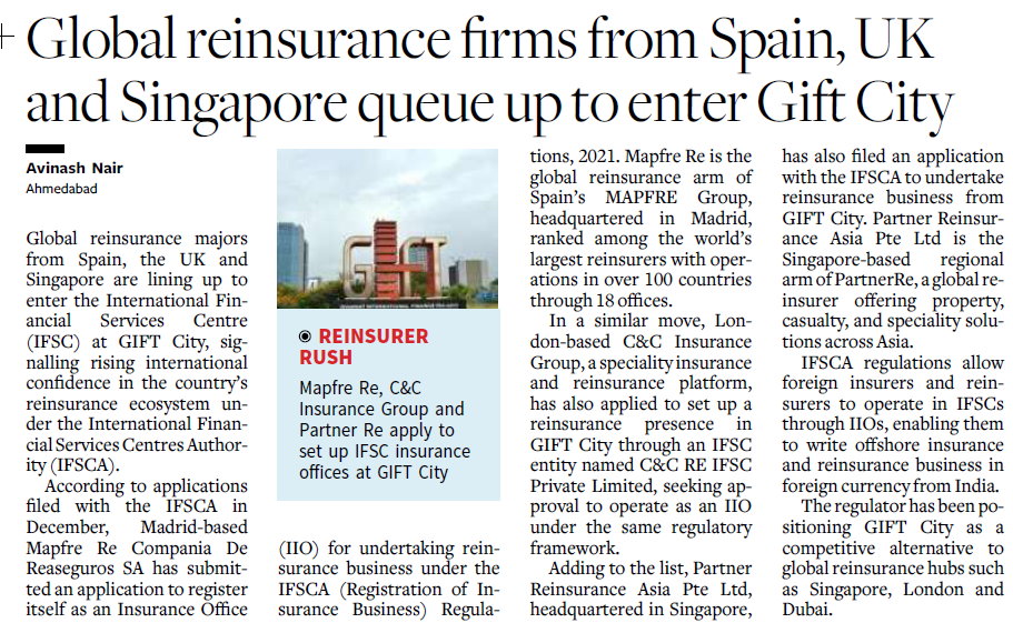 Global reinsurance majors from Spain, the UK and Singapore are lining up to enter the International Financial Services Centre (IFSC)...