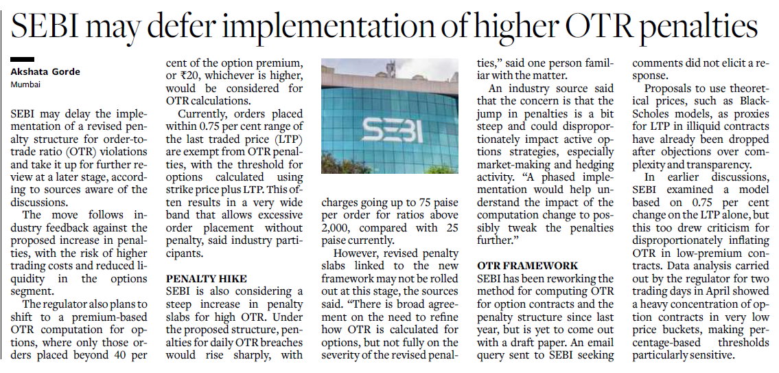 SEBI may delay the implementation of a revised penalty structure for order-to-trade ratio (OTR) violations and take it up for...