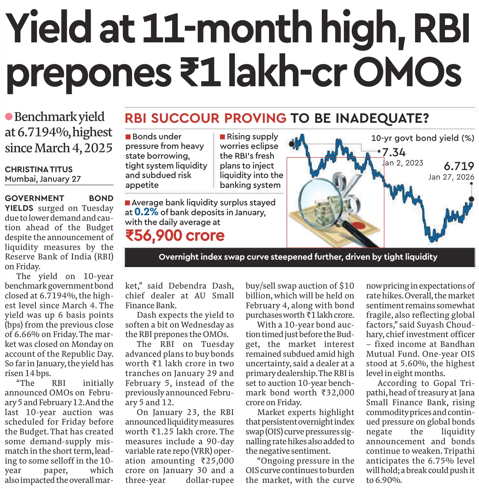 GOVERNMENT BOND YIELDS surged on Tuesday due to lower demand and caution ahead of the Budget despite the announcement of...