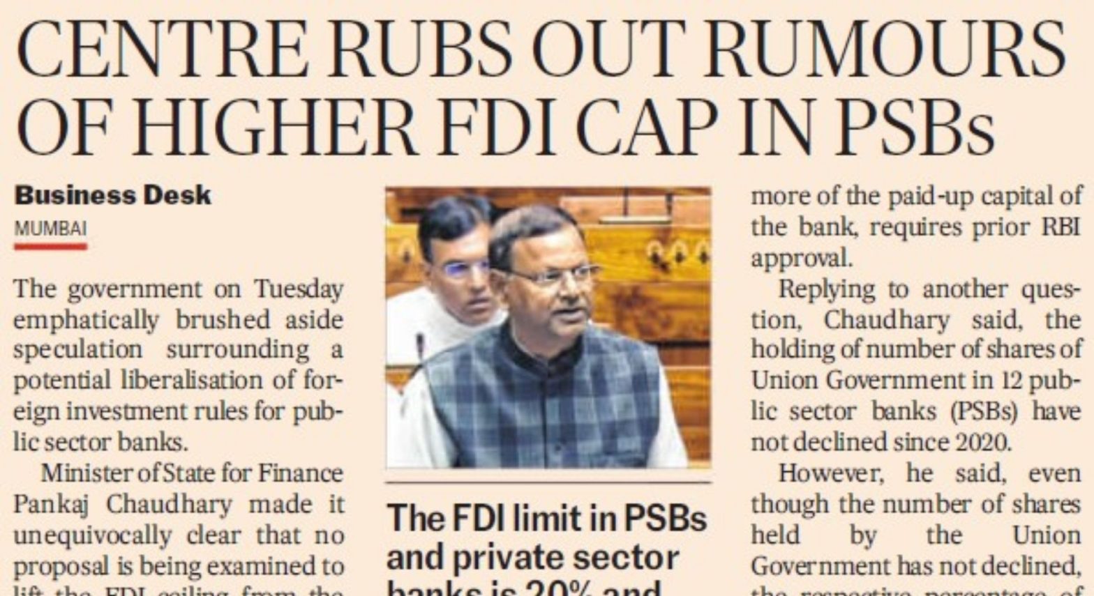 Government Clarifies: No Plans to Raise FDI Limit in Public Sector BanksThe government on Tuesday firmly dismissed market speculation about a...