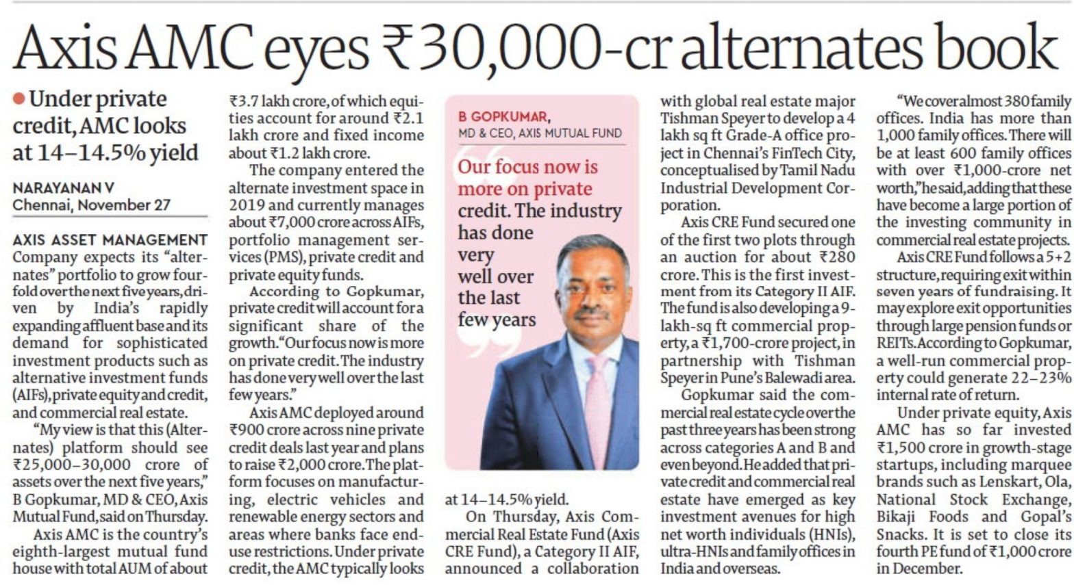 Axis AMC Aims for Fourfold Growth in Alternates to ₹30,000 Crore, Driven by Private Credit and CREAxis Asset Management Company...
