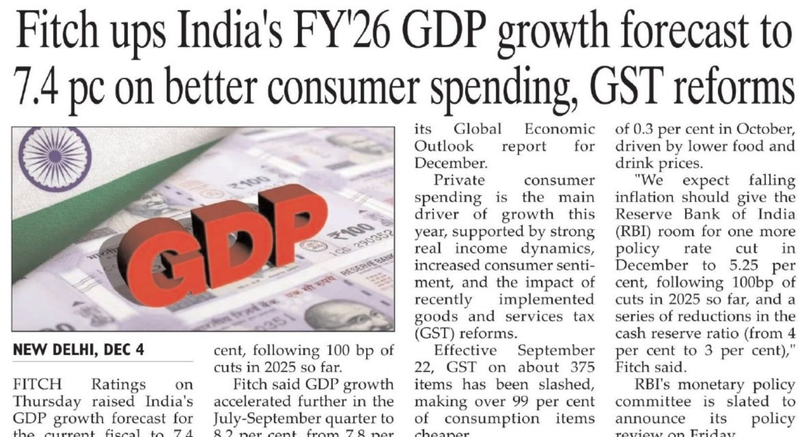 Fitch Raises India's FY26 GDP Growth Forecast to 7.4% Amid Strong Consumption & GST BoostFITCH Ratings on Thursday raised India's...