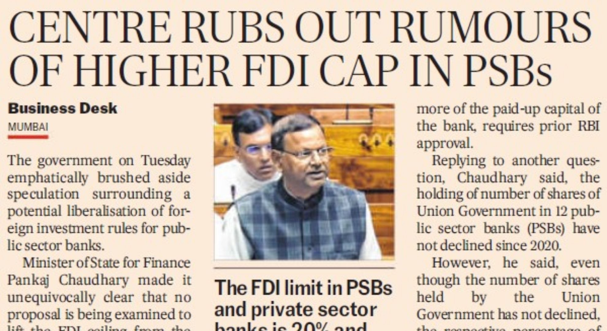 Minister of State for Finance Pankaj Chaudhary confirmed in the Rajya Sabha that no proposal is under consideration to increase the FDI ceiling from the existing 20% to 49%.
