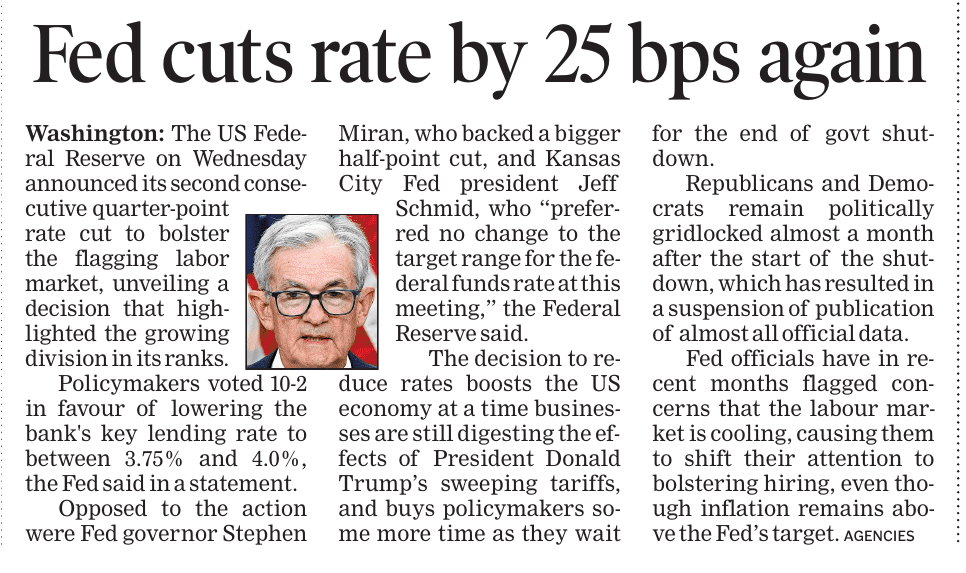 Opposed to the action were Fed governor Stephen Miran, who backed a bigger half-point cut, and Kansas City Fed president Jeff Schmid, who “preferred no change to the target range for the federal funds rate at this meeting,” the Federal Reserve said. The decision to reduce rates boosts the US economy at a time businesses are still digesting the effects of President Donald Trump’s sweeping tariffs, and buys policymakers some more time as they wait for the end of govt shutdown.