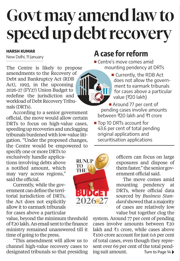 The Centre is likely to propose amendments to the Recovery of Debt and Bankruptcy Act (RDB Act), 1993, in the upcoming 2026–27 (FY27) Union Budget to redefine the jurisdiction and workload of Debt Recovery Tribunals (DRTs). According to a senior government official, the move would allow certain DRTs to focus on high-value cases, speeding up recoveries and unclogging tribunals burdened with low-value litigation.