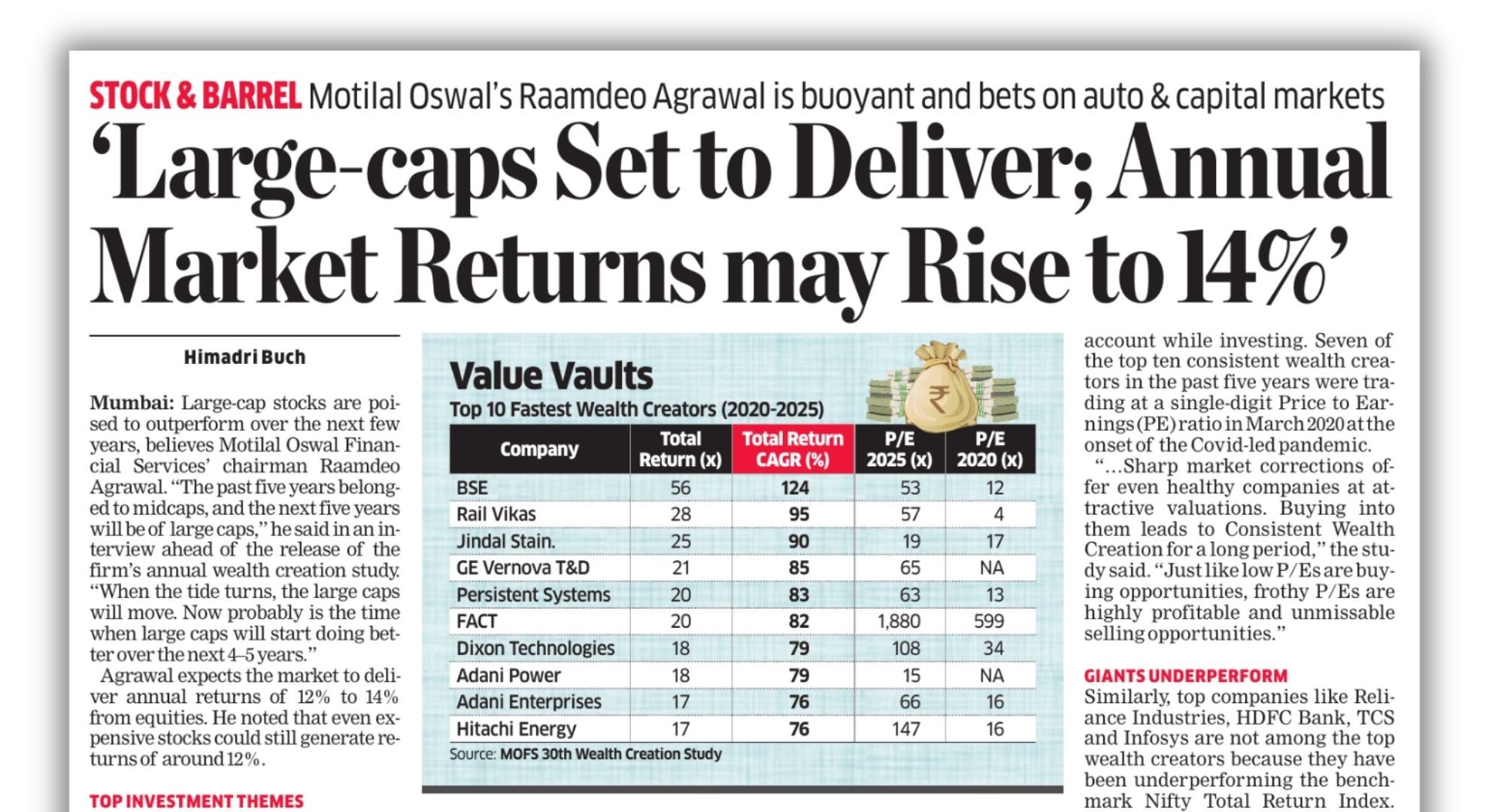 India’s equity market may be preparing for a leadership shift. According to Raamdeo Agrawal, Chairman of Motilal Oswal Financial Services, the next 4–5 years could mark a strong phase for large‑cap stocks, after a period dominated by midcaps.