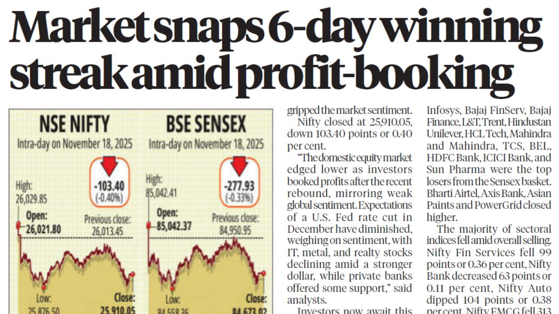 Indian stock indices closed lower on Tuesday, snapping the sixth session’s winning streak amid profit booking. Sensex closed at 84,673.02, down 277.93 points (0.33%). The 30-share index started the session flat at 85,042.37 against the previous close of 84,950.95. Later, the index slipped into negative territory as selling pressure gripped market sentiment.