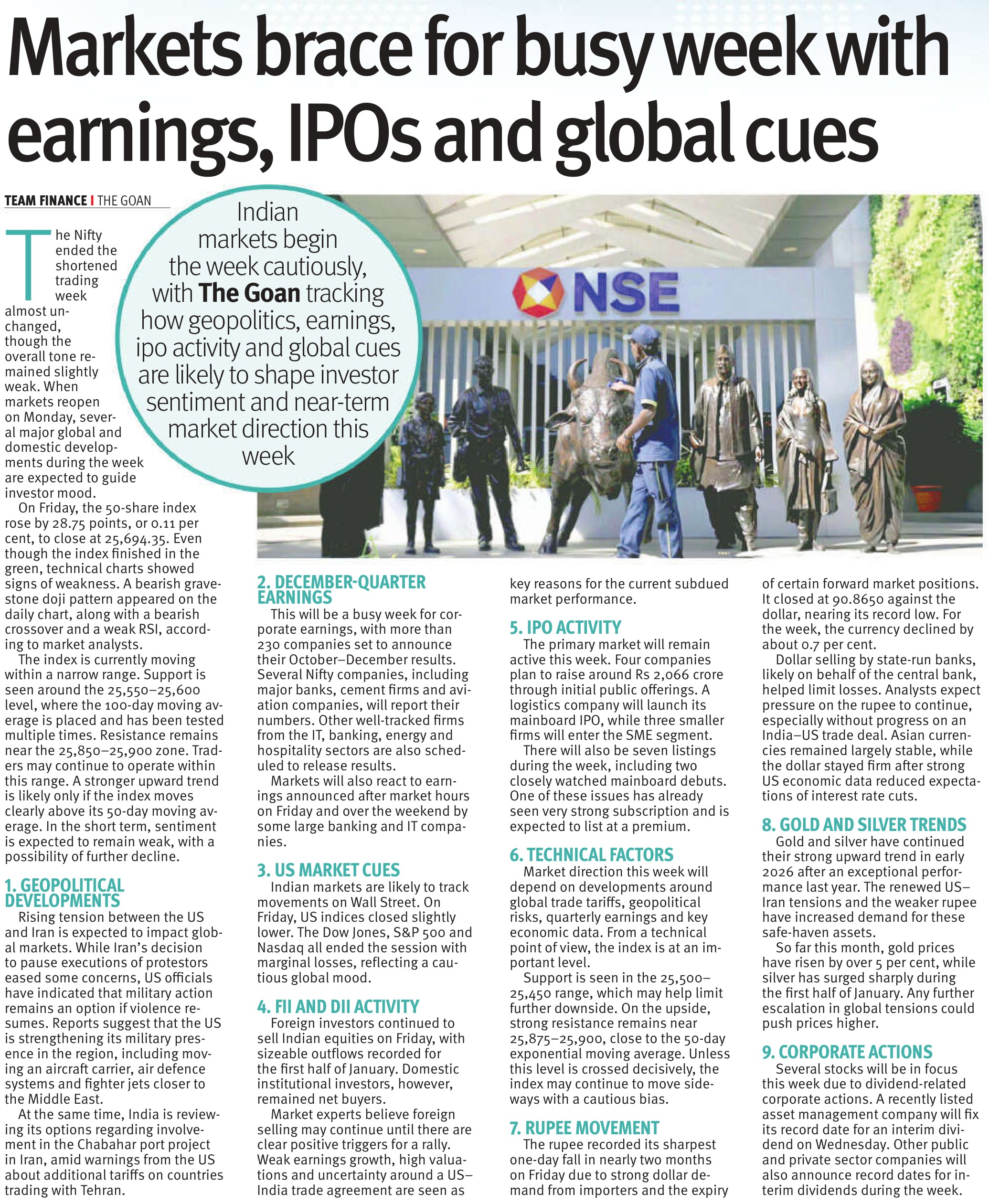 This will be a busy week for corporate earnings, with more than 230 companies set to announce their October–December results. Several Nifty companies, including major banks, cement firms and aviation companies, will report their numbers. Other well-tracked firms from the IT, banking, energy and hospitality sectors are also scheduled to release results.