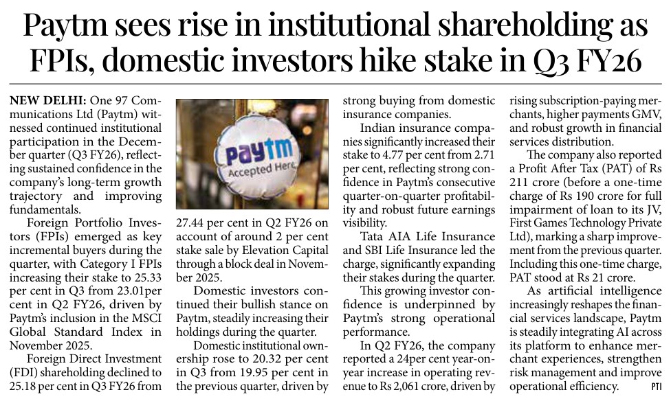 One 97 Communications Ltd (Paytm) witnessed continued institutional participation in the December quarter (Q3 FY26), reflecting sustained confidence in the company’s long-term growth trajectory and improving fundamentals. Foreign Portfolio Investors (FPIs) emerged as key incremental buyers during the quarter, with Category I FPIs increasing their stake to 25.33 per cent in Q3 from 23.01 per cent in Q2 FY26, driven by Paytm’s inclusion in the MSCI Global Standard Index in November 2025.