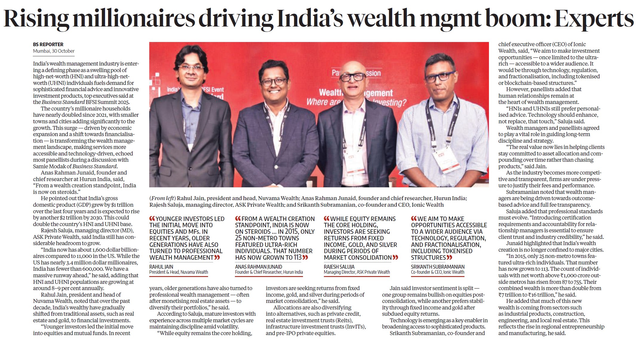 India’s wealth management industry is entering a defining phase as a swelling pool of high-net-worth (HNI) and ultra-high-networth (UHNI) individuals fuels demand for sophisticated financial advice and innovative investment products, top executives said at the Business Standard BFSI Summit 2025. The country’s millionaire households have nearly doubled since 2021, with smaller towns and cities adding significantly to the growth. This surge driven by economic expansion and a shift towards financialisation is transforming the wealth management landscape, making services more accessible and technology-driven, echoed most panellists during a discussion with Samie Modak of Business Standard. Anas Rahman Junaid, founder and chief researcher at Hurun India, said, “From a wealth creation standpoint, India is now on steroids.” He pointed out that India’s gross domestic product (GDP) grew by $1 trillion over the last four years and is expected to rise by another $2 trillion by 2030. This could double the country’s HNI and UHNI base. Rajesh Saluja, managing director (MD), ASK Private Wealth, said India still has considerable headroom to grow. “India now has about 1,600 dollar billionaires compared to 11,000 in the US. While the US has nearly 3.4 million dollar millionaires, India has fewer than 600,000. We have a massive runway ahead,” he said, adding that HNI and UHNI populations are growing at around 8–9 per cent annually. Rahul Jain, president and head of Nuvama Wealth, noted that over the past decade, India’s wealthy have gradually shifted from traditional assets, such as real estate and gold, to financial investments. “Younger investors led the initial move into equities and mutual funds.
