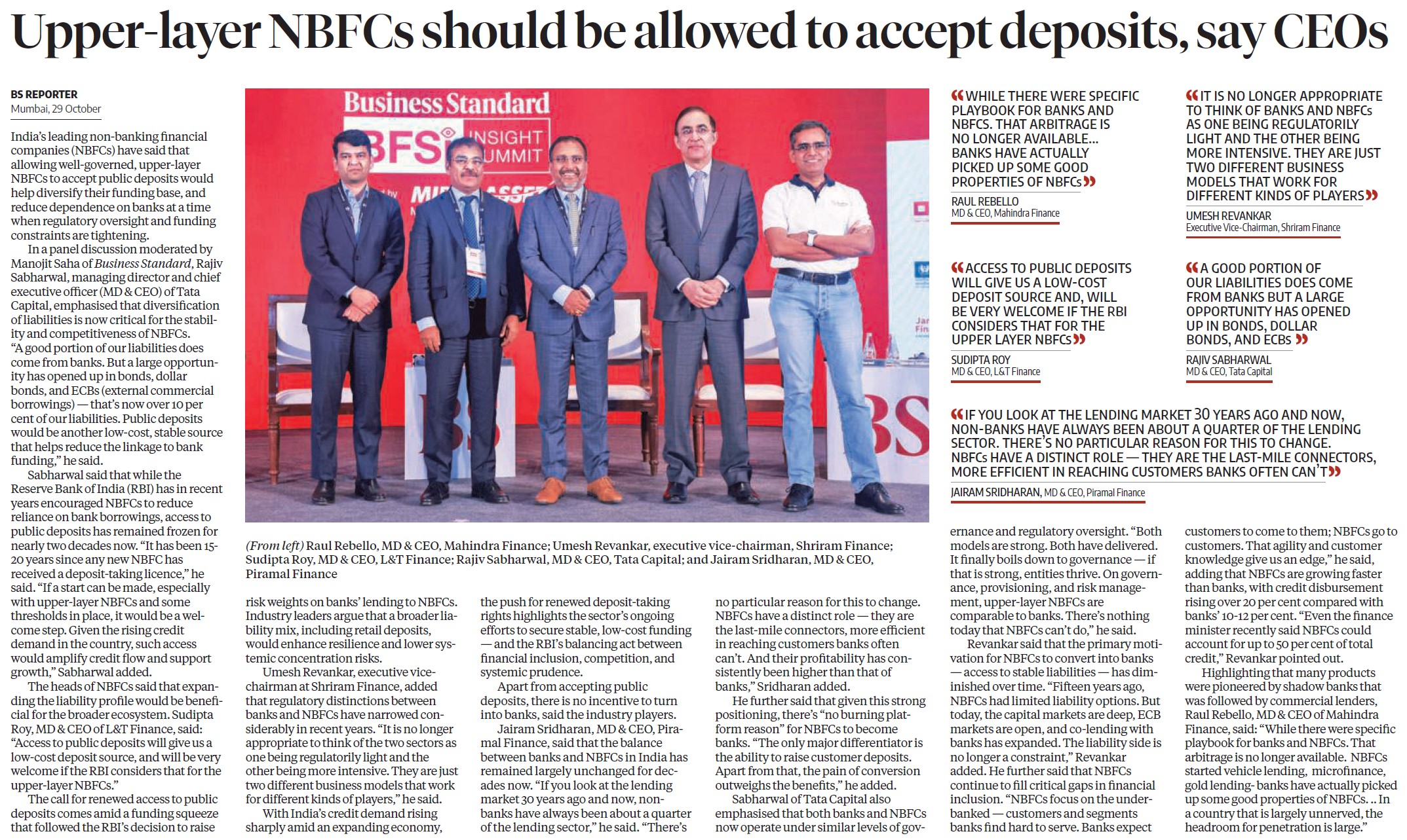 In a panel discussion moderated by Manojit Saha of Business Standard, Rajiv Sabharwal, managing director and chief executive oicer (MD & CEO) of Tata Capital, emphasised that diversification of liabilities is now critical for the stability and competitiveness of NBFCs. “A good portion of our liabilities does come from banks. But a large opportunity has opened up in bonds, dollar bonds, and ECBs (external commercial borrowings) that’s now over 10 per cent of our liabilities. Public deposits would be another low-cost, stable source that helps reduce the linkage to bank funding,” he said. Sabharwal said that while the Reserve Bank of India (RBI) has in recent years encouraged NBFCs to reduce reliance on bank borrowings, access to public deposits has remained frozen for nearly two decades now. “It has been 15- 20 years since any new NBFC has received a deposit-taking licence,” he said. “If a start can be made, especially with upper-layer NBFCs and some thresholds in place, it would be a welcome step. Given the rising credit demand in the country, such access would amplify credit flow and support growth,” Sabharwal added.